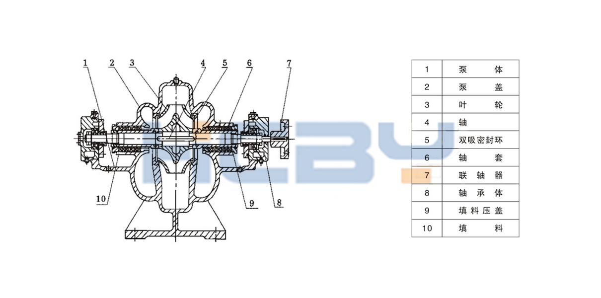 本型泵的吸入口與吐出口均在水泵軸心線的下方,與軸線垂直成水平方向。檢修時無需拆卸進(jìn)出口水管及電機(jī)。從傳動方向看去,水泵為順時針方向旋轉(zhuǎn)(根據(jù)用戶需要亦可改為逆時針方向旋轉(zhuǎn))。 泵主要零件有:泵體、泵蓋、葉輪、軸、雙吸密封環(huán)、軸套等。 泵體與泵蓋構(gòu)成葉輪的工作室。在進(jìn)出水法蘭上,制有安裝真空表和壓力表的管螺孔。進(jìn)出水法蘭的下部,制有放水的管螺孔。 經(jīng)過靜平衡校驗的葉輪,用軸套和兩邊的軸套螺母固定在軸上,其軸向位置可通過軸套螺母進(jìn)行調(diào)整。 泵軸由兩個單列向心球軸承支承。軸承裝在軸承體內(nèi)、安裝在泵體兩端,用黃油潤滑。 雙吸密封環(huán)用以減少水泵壓水室的水漏回吸水室。 泵通過彈性聯(lián)軸器由電動機(jī)直接傳動,必要時亦可用內(nèi)燃機(jī)傳動。 軸封為軟填料密封(根據(jù)用戶需要可采用機(jī)械密封結(jié)構(gòu))。 結(jié)構(gòu)特點(diǎn) 1. 結(jié)構(gòu)緊湊 外形美觀,穩(wěn)定性好,便于安裝。 2. 運(yùn)行平穩(wěn) 優(yōu)化設(shè)計的雙吸葉輪使軸向力減小到**限度,且有優(yōu)異水力性能的葉型,并經(jīng)精密鑄造,泵殼內(nèi)表面及葉輪表面極其光華具有顯著的抗汽蝕性能和高效率。 3. 軸 承 選用SKF及NSK軸承保證運(yùn)行平穩(wěn),噪音低,使用壽命長。 4. 軸 封 選用BURGMANN機(jī)械密封或填料密封。能保證8000小時運(yùn)行無泄漏。 5. 安裝形式 裝配時不需調(diào)整,可根據(jù)現(xiàn)場使用條件。分立式或臥式安裝。 6. 加裝自吸裝置,可實現(xiàn)自動吸水,即不需安裝底閥,不需真空泵,不需倒灌,泵可以啟動。